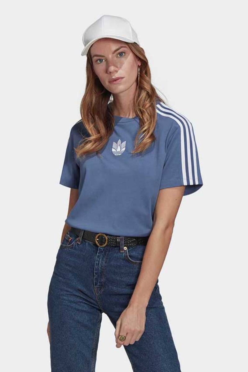 Adidas Women’s ADICOLOR 3D Trefoil Loose T-Shirt in Crew Blue mixes retro looks with modern comfort. It has a relaxing, loose, and oversized fit that is stylish and easy to wear. The Adidas Women’s ADICOLOR 3D TREFOIL LOOSE T-SHIRT in Crew Blue features the classic 3 Stripes logo on the shoulders and sleeves. The bold 3D Trefoil logo on the chest adds a fresh touch. Made from high-quality and soft cotton, this tee looks fabulous and feels comfortable. No matter if you pair it with denim, shorts, or joggers, this loose Adidas top looks sporty and confident. This T-shirt is a great loose fit. It’s comfy and stylish, perfect for easygoing days.