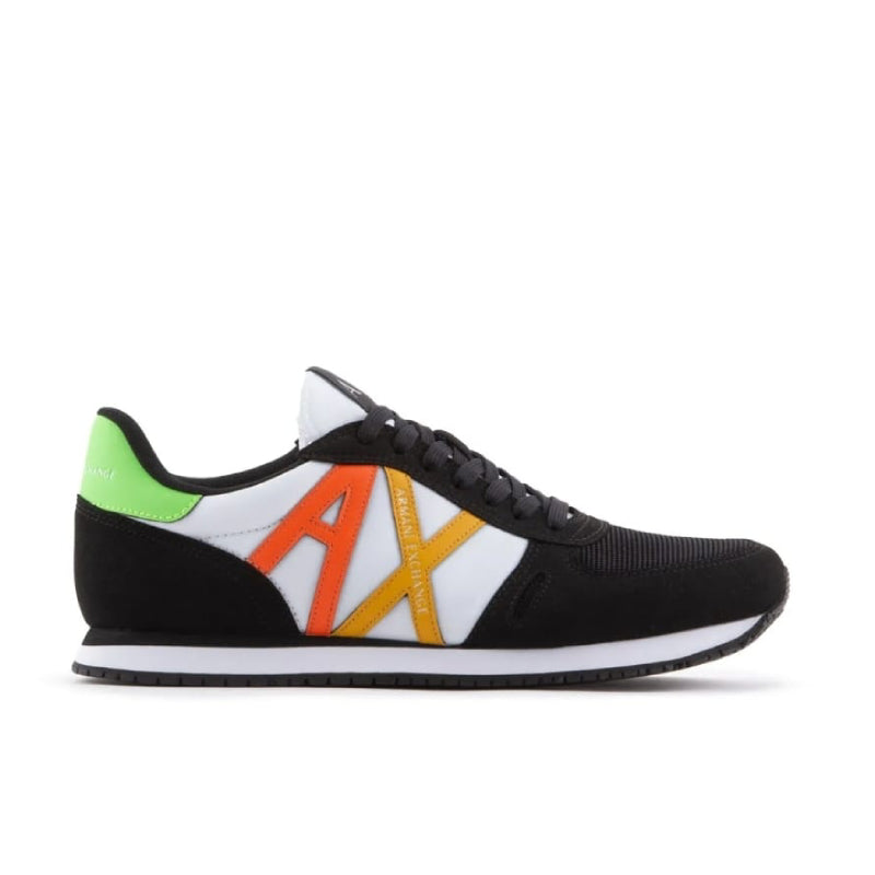 Step up your style with these Armani Exchange trainers. They mix the classic running shoe design with a bright, modern touch. The shoe has a black-colored suede and forged upper, which provides a smooth and comfortable fit. There is a bold “AX” logo is in favor of the shoe. It has a fun color gradient of orange and yellow, which adds a lively touch. Armani Exchange trainers blend athletic performance with bold style. This shoe stands out in any collection. The white midsole and black sole have a classic tread pattern. The design offers comfort and stability. A bright lime green heel tab adds a fun pop of color. This detail makes these trainers a standout in any casual outfit. They’re the perfect blend of athletic performance and urban-chic style.