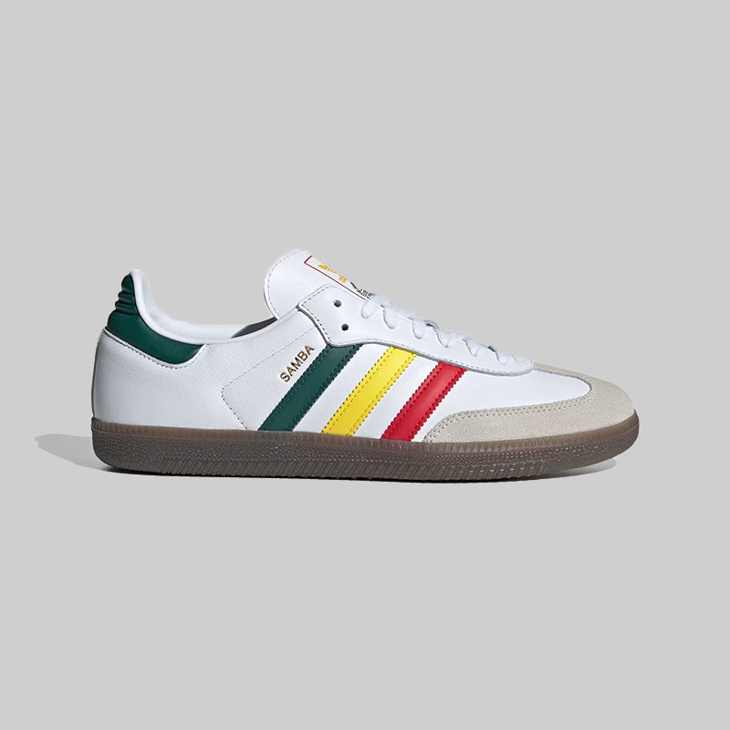 Add some accessorizing to your outfit and liven up the classic silhouette using the Adidas Samba. This striking pair comes with a white leather upper. It features bold red, yellow, and green stripes inspired by Rasta culture. The shoe has white laces. It includes a soft textile lining for comfort. A cushioned footbed guarantees support for all-day comfort, and the Adidas branding stays true to form with a subtle “Samba” logo stamped on the side. The Adidas Samba OG White Rasta Trainers Shoes feature a brown gum outsole that adds retro appeal. It enhances traction and stability for everyday use as well. The sneaker’s secure lace-up closure and regular fit provide ease of wear. This makes them ideal for casual outings, adding relaxed street style, or trending wardrobe sneakers that provide a pop of color to outfits.